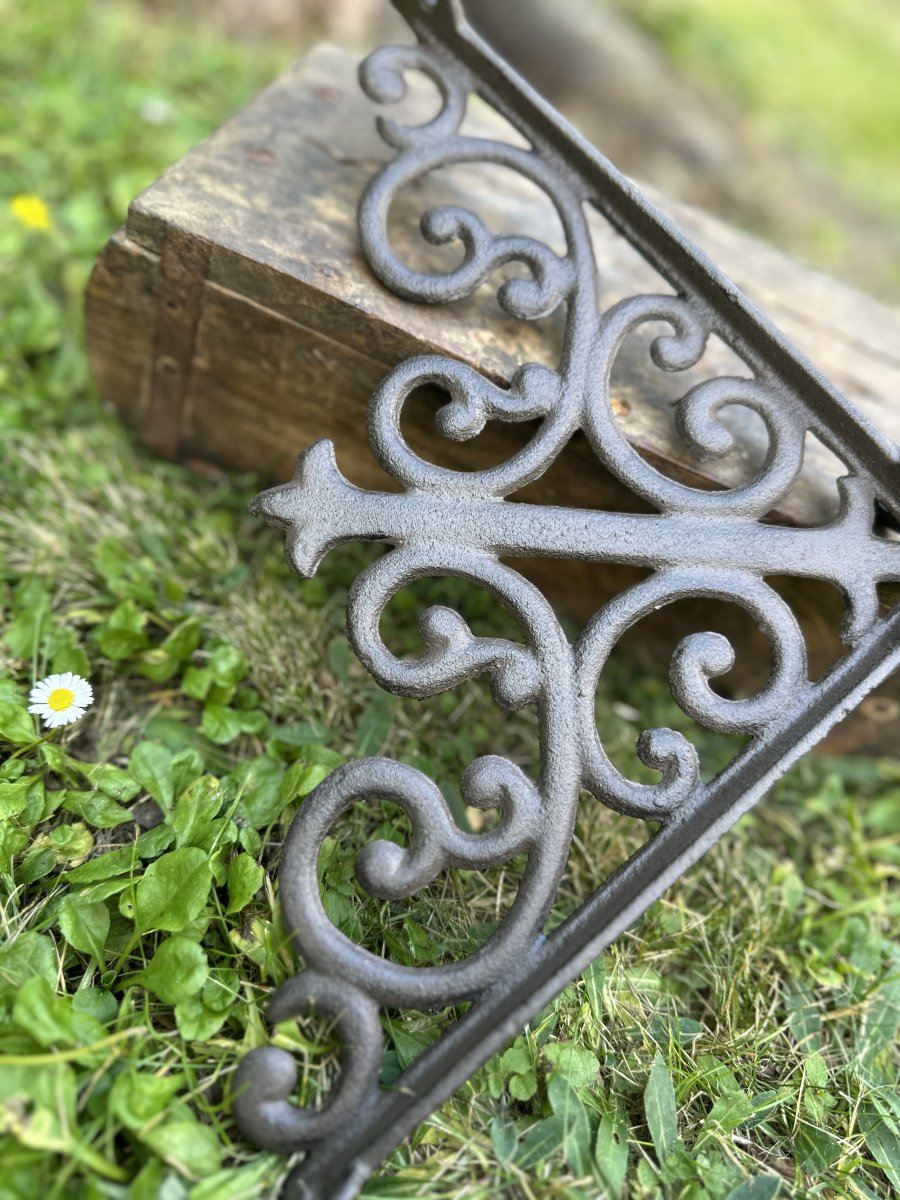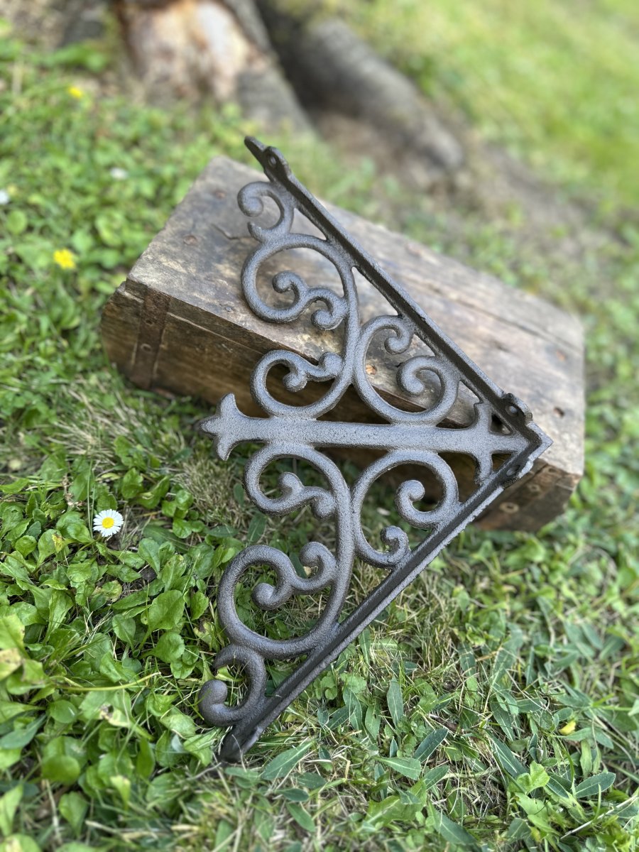 Konsol i smide till tex hylla i brun/svart smide detaljrikt utformad. Passar lika bra inne som ute. Går i en brun / svart ruffig nyans.