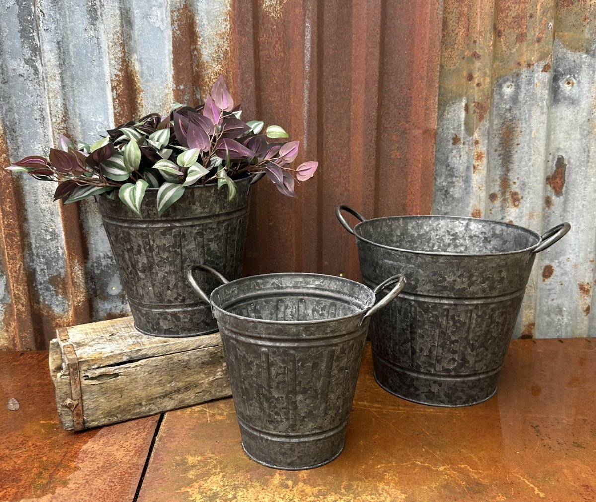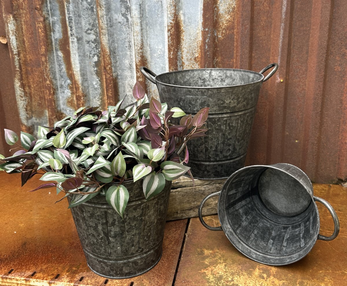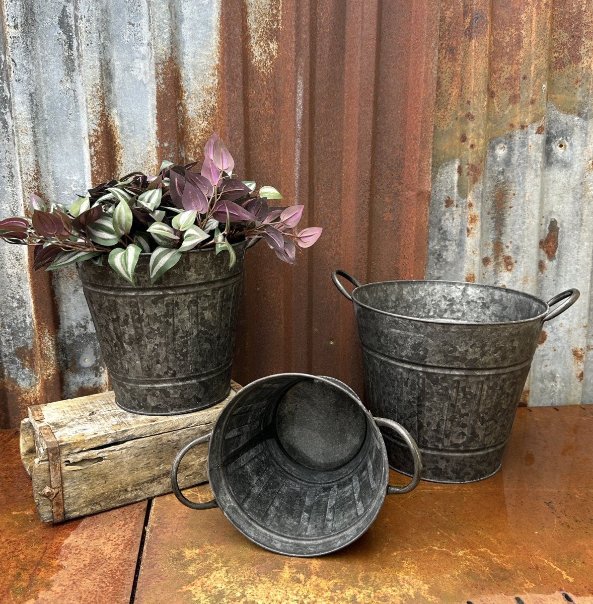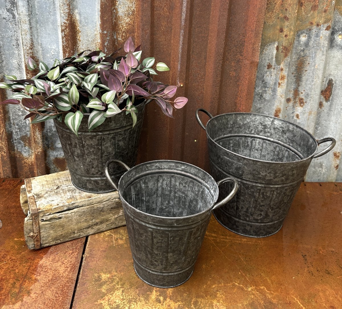 Kruka / tunna i mörkare zink med handtag. För förvaring och dekoration inomhus som utomhus.