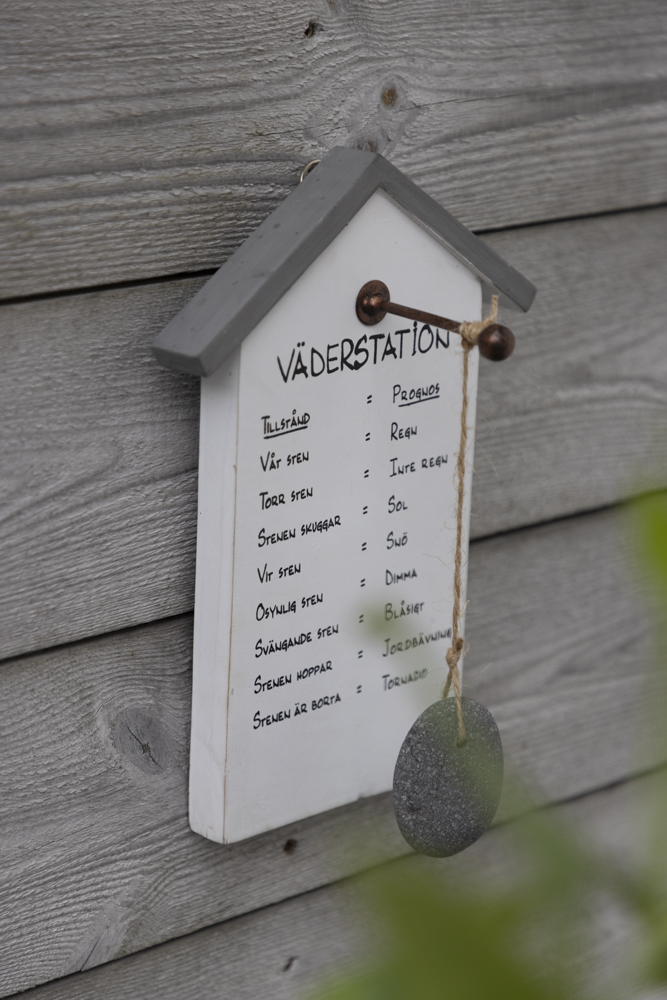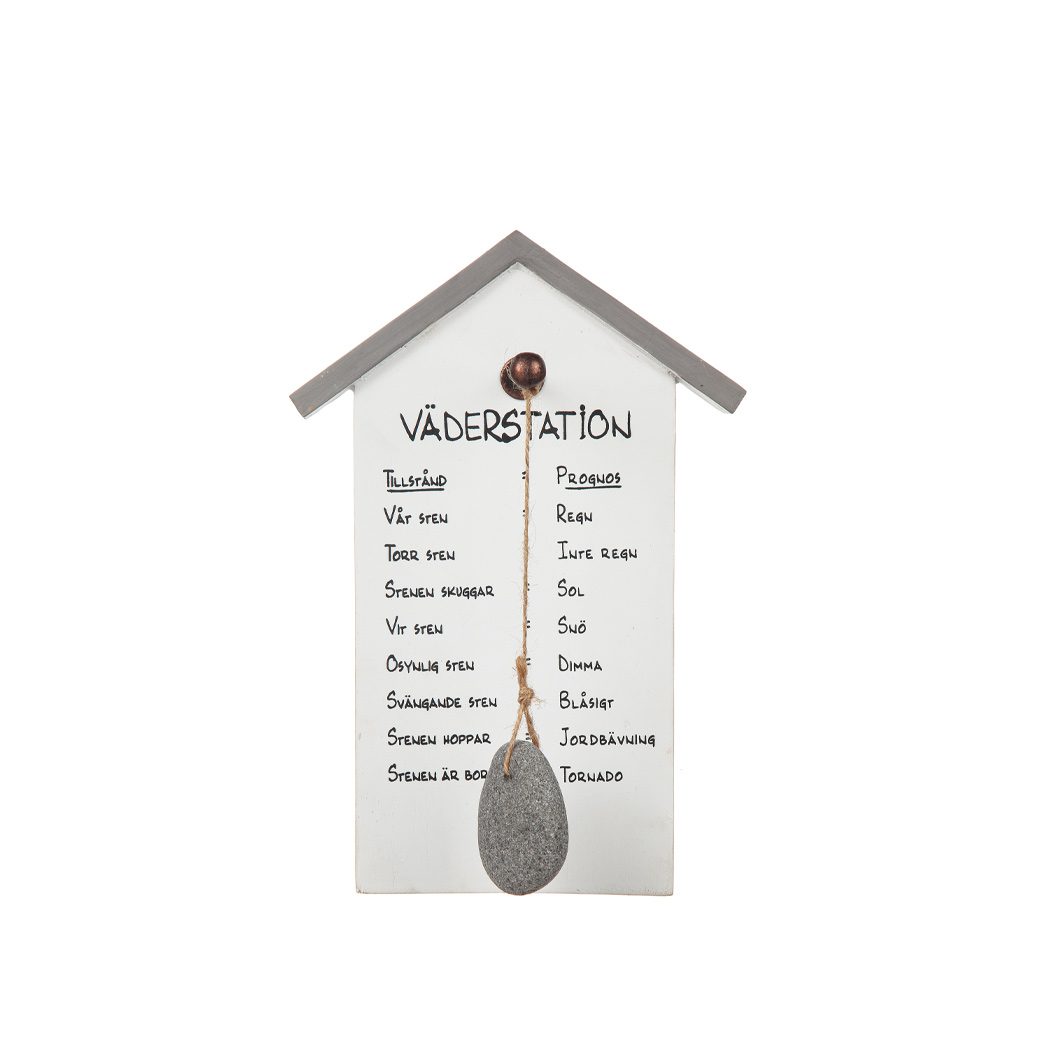 Väderstation i trä med drivveds känsla. Vitmålad med skavda kanter och gråa detaljer. Grå text och snöre med sten i mitten. Stenens rörelse berättar via skriften hur vädret är. Fäste för upphängning på baksidan. En rolig och dekorativ dekoration i trädgården på altanen alt balkongen.