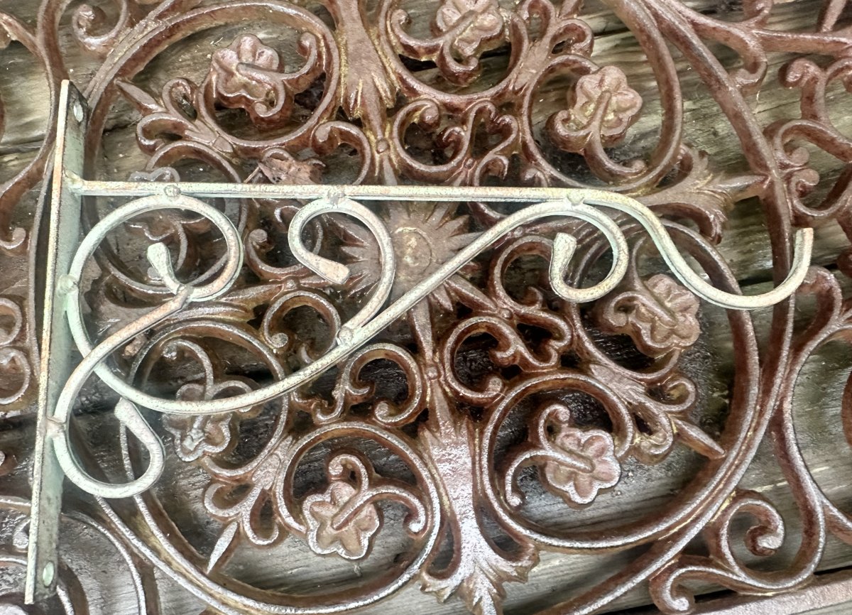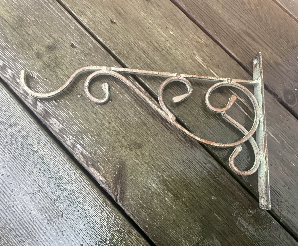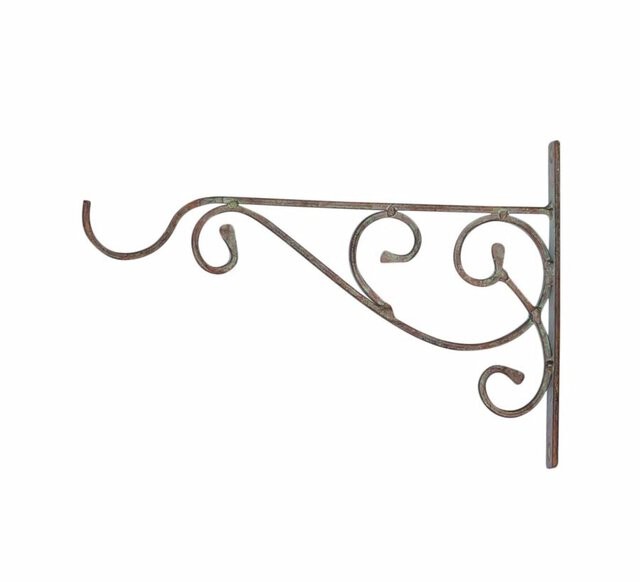 Väggkrok för tex lyktor och amplar. Går i en antik grön ruffig nyans med rost bruna inslag. Vackert dekorerad med snirklig dekor. Passande såväl inomhus som utomhus.
