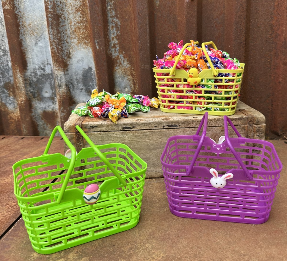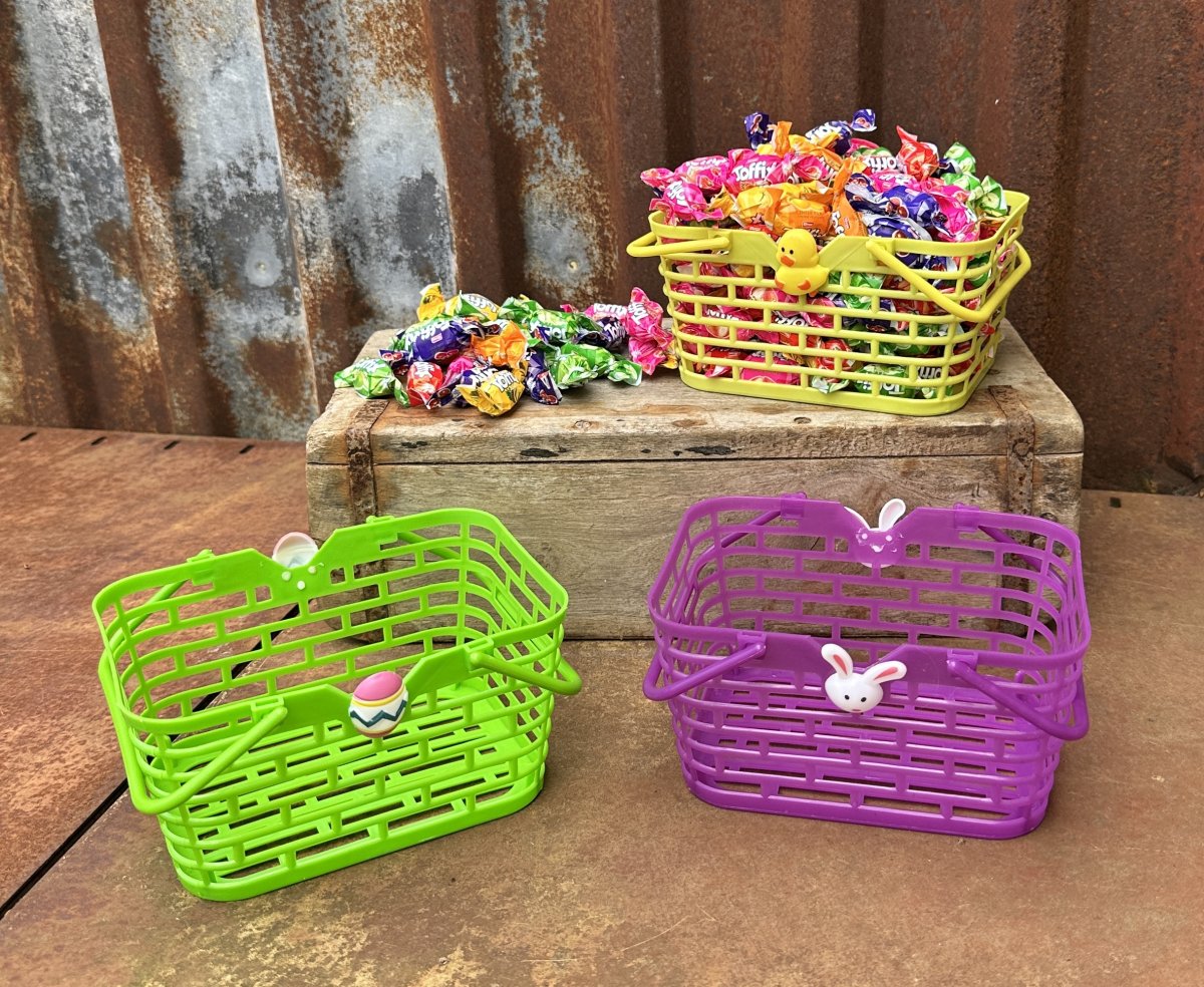 Färgglad korg med två ledade handtag. Korgen är tillverkad i plast och dekorerad med en liten figur på båda lång sidorna. Finns i tre nyanser