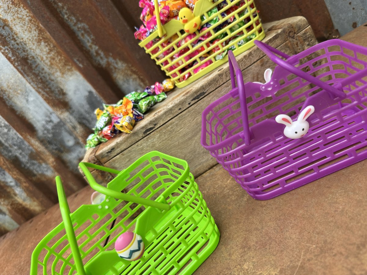 Färgglad korg med handtag med kanin kyckling och påskägg