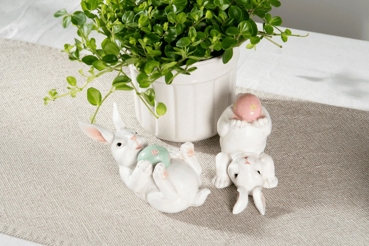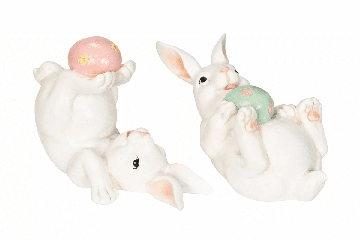 Vit kanin med ägg. Lekfull och gullig modell som finns i två utföranden