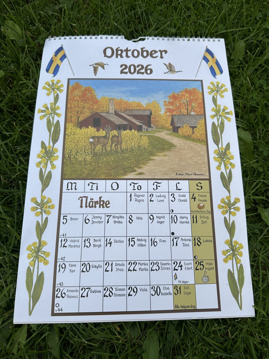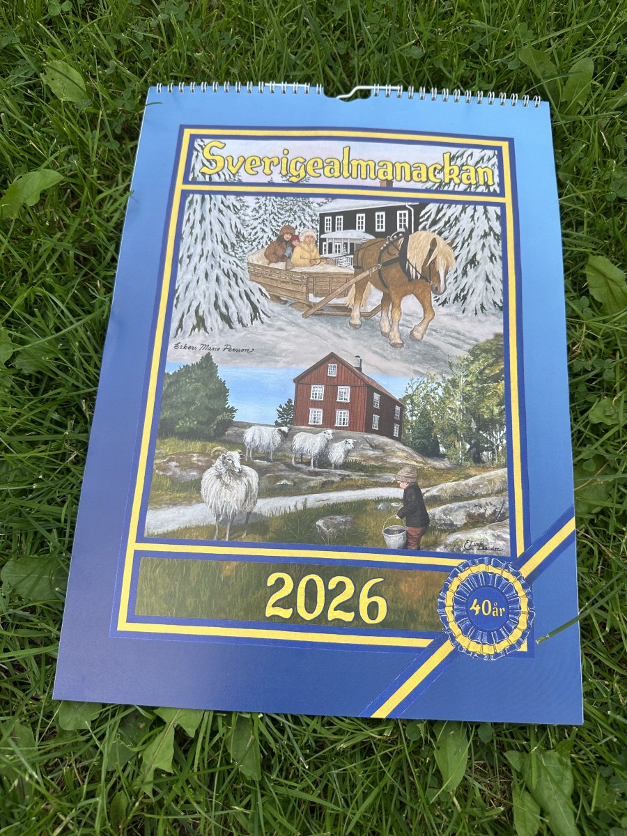 Väggalmanacka för 2026 A4 modell från Sverigealmanackan med vackra bilder i gammeldags stil av Erkers Maria Persson och E Linda Leander