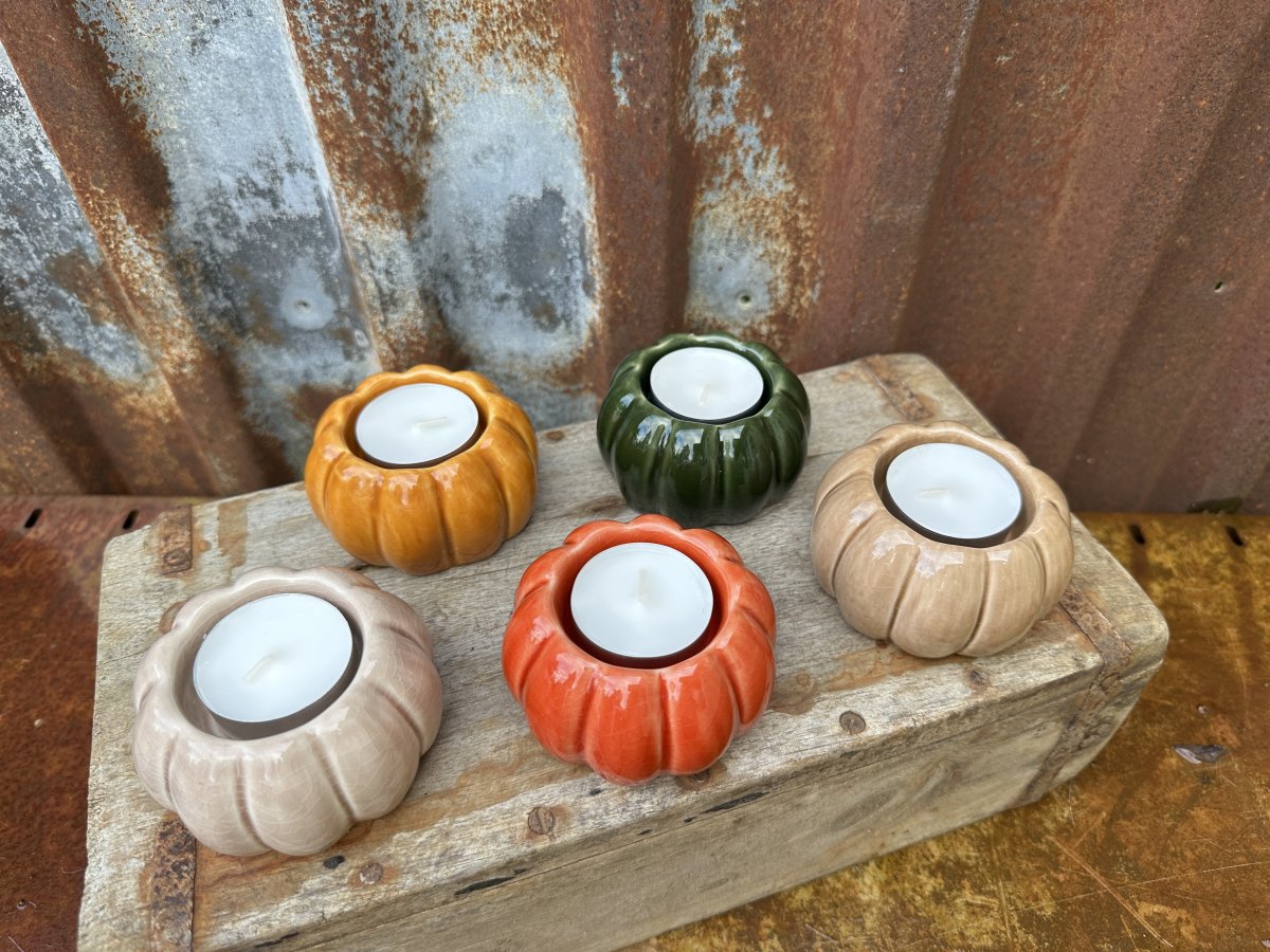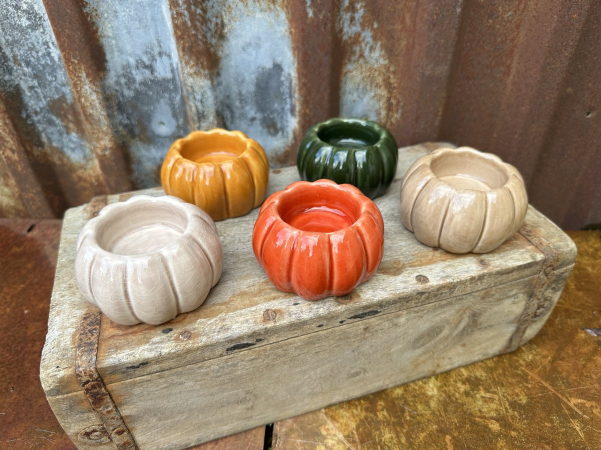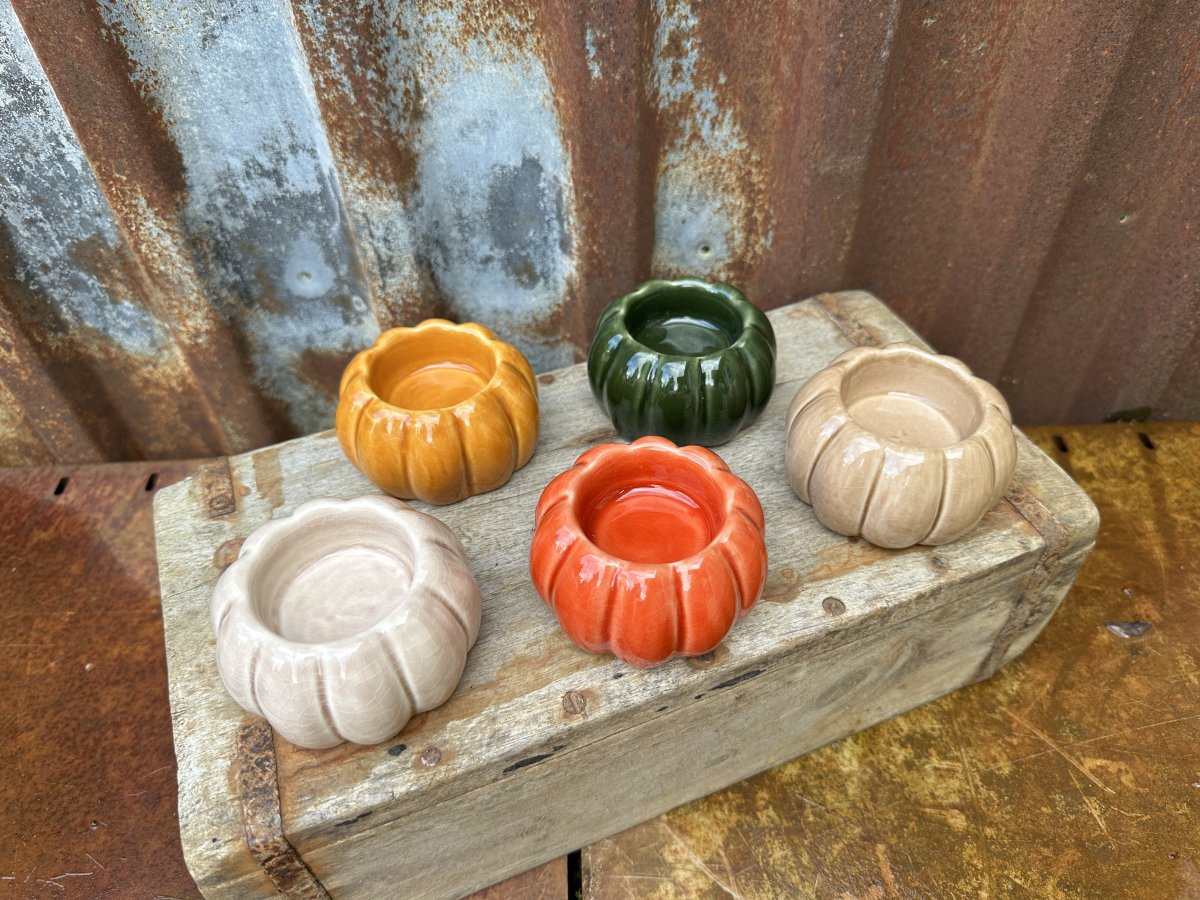Pumpa formad ljuslykta i keramik. Färgglad modell som finns i olika nyanser