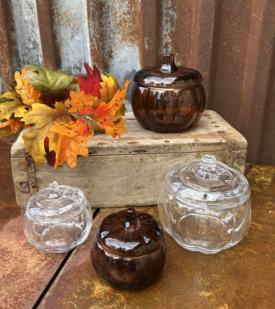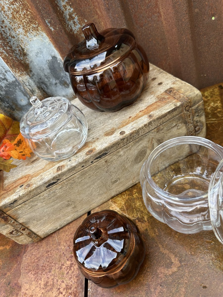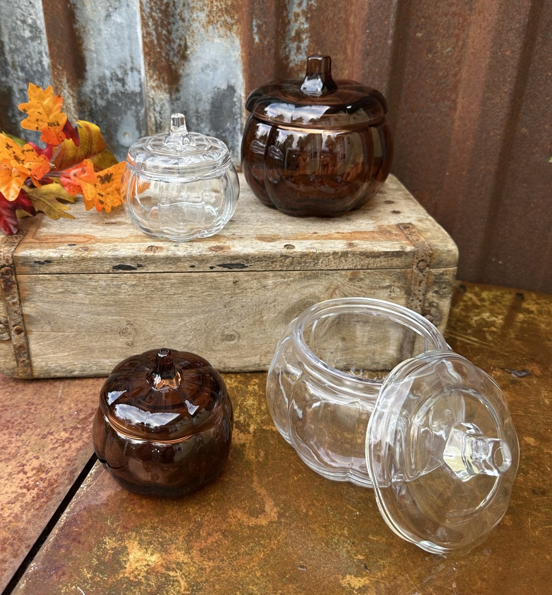 Pumpa formad skål i glas med lock. Elegant och vacker för dekoration och förvaring finns i två olika nyanser och två olika storlekar