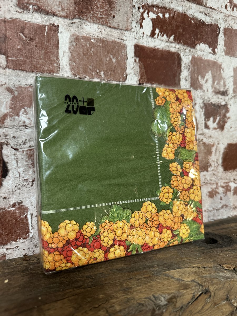Färgglada och detaljrika servetter med motiv av gyllen gul/röda hjortron på skogs grön bas.