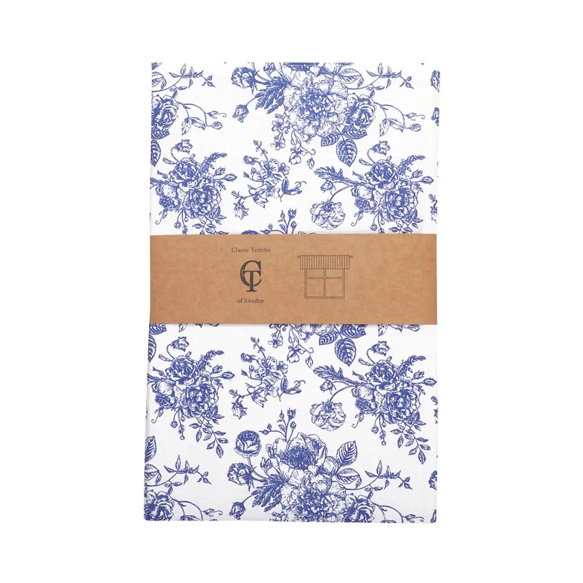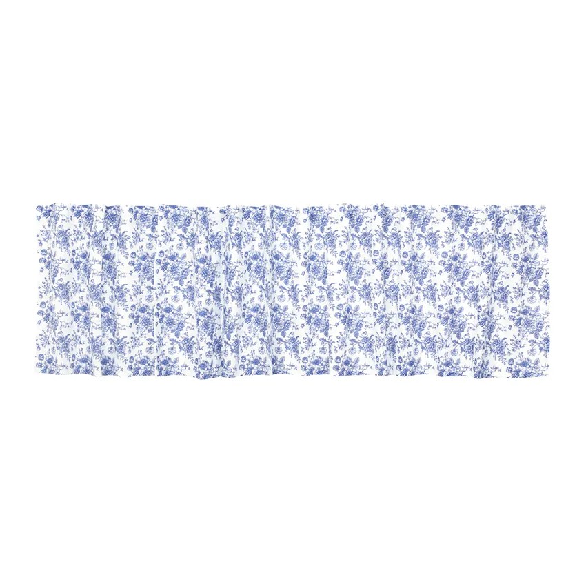 Romantisk vit gardinkappa med blåa blommor. Gardinen har multiband, vilket gör att du kan hänga upp den på tre olika sätt: med fingerkrokar, rynkbandskrokar eller direkt på stången med hällor.