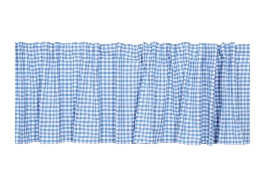 Ljusblå och vit rutig gardinkappa i lantlig stil som passar perfekt till köksfönstret. Med denna gardinkappa blir inredningen i köket både mysig och hemtrevlig. Gardinen har multiband, vilket gör att du kan hänga upp den på tre olika sätt: med fingerkrokar, rynkbandskrokar eller direkt på stången med hällor. Den är en del av serien Bella från Recycled by Wille