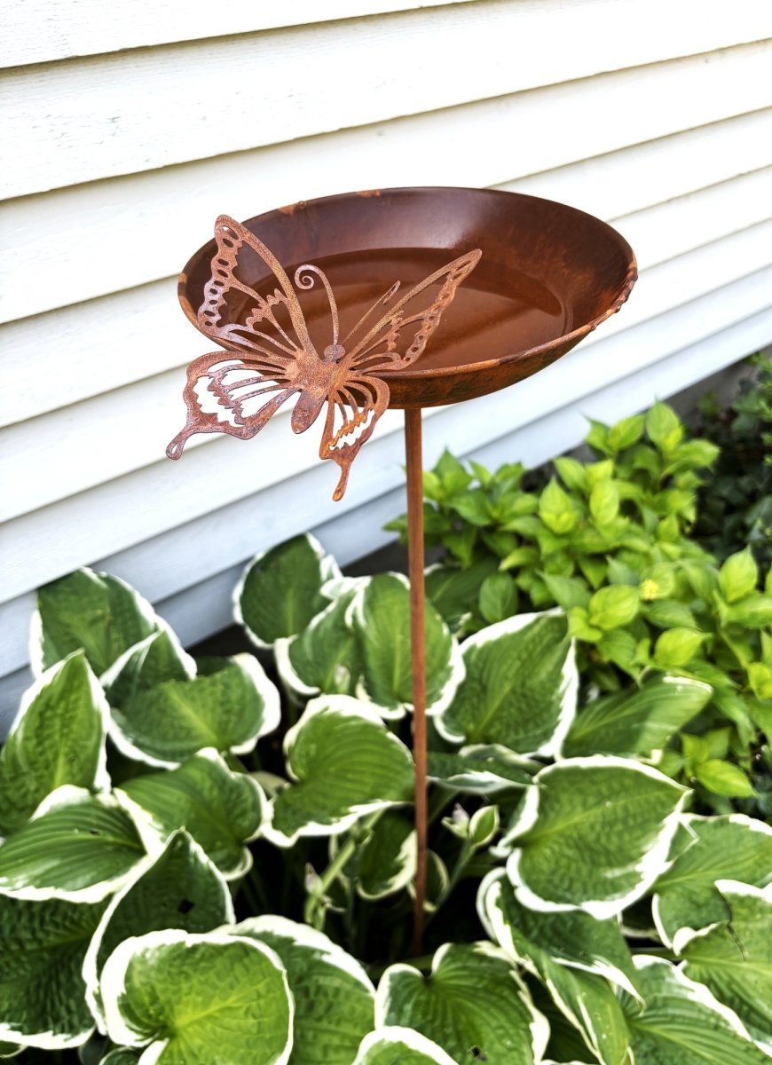 Fågelbad på pinne i rost med fjäril