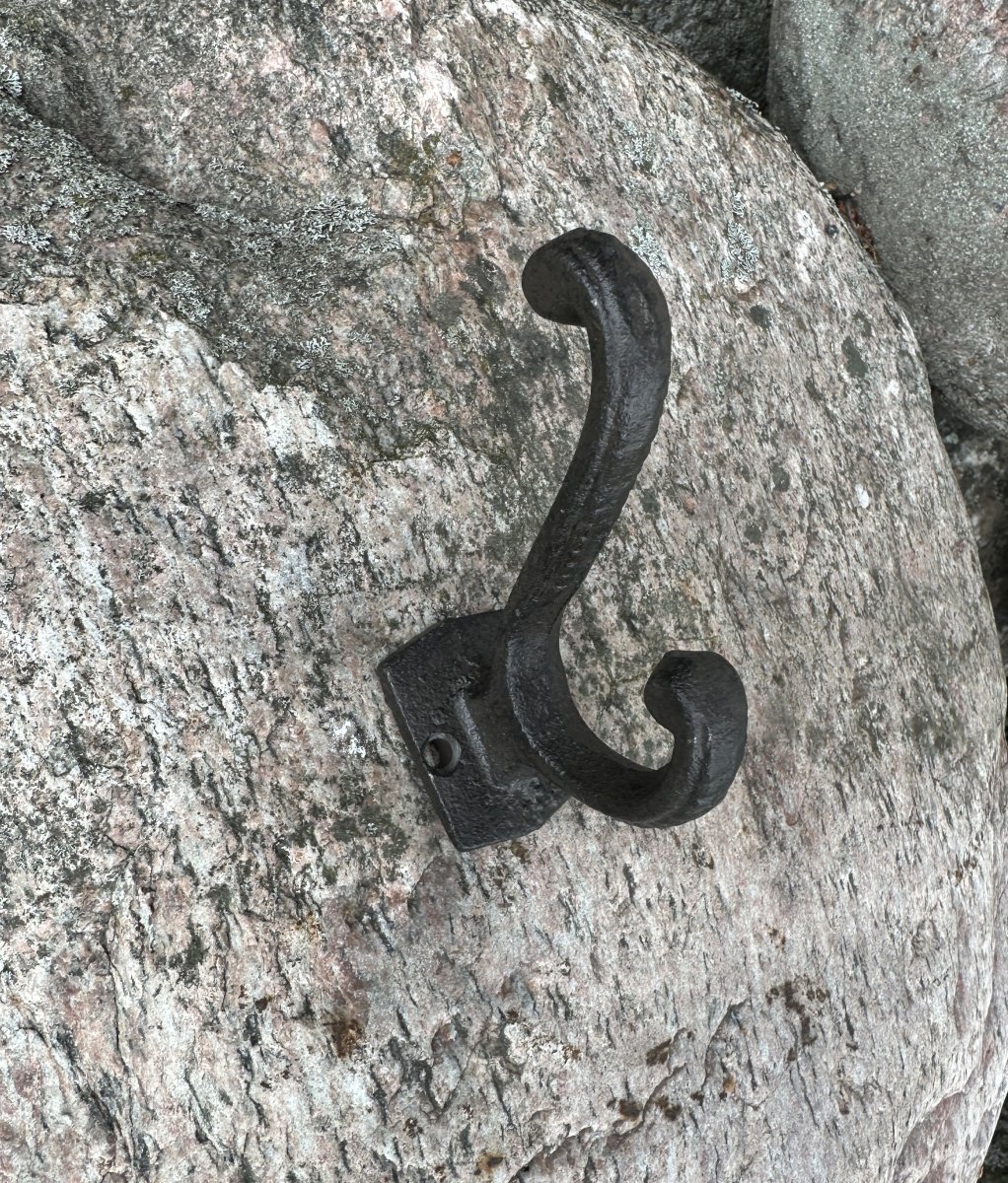 Klassisk dubbel krok i gjutjärn. I modell med två krokar och kantig ryggplatta. Går i en ruffig svart brun nyans.