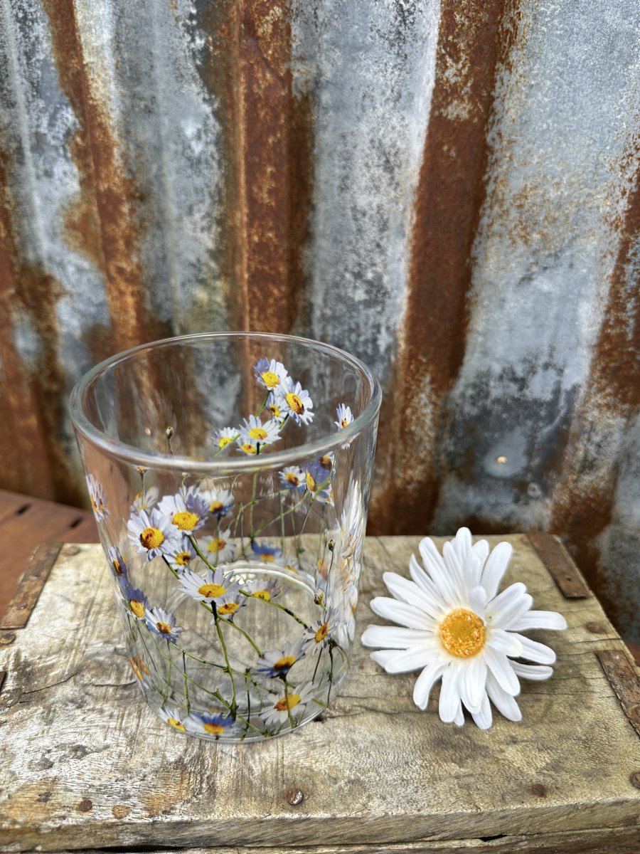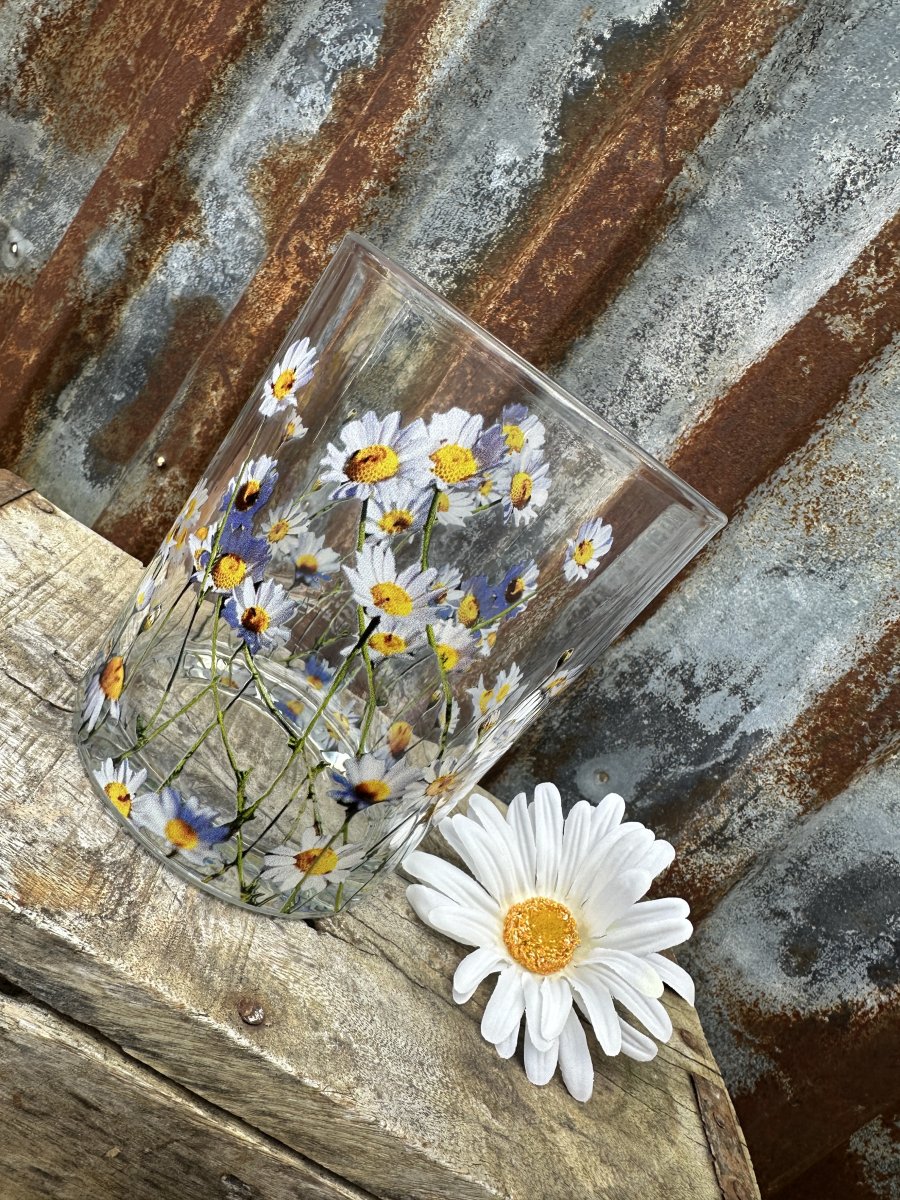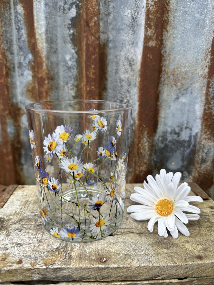 Vacker ljuslykta till lika vas med motiv av prästkragar. Rund modell tillverkad i kraftigare glas motiv av blommor runt om.
