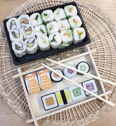 Sushi bricka i trä, med flera delar och pinnar. Detaljrik och välarbetad i fina färgar och verklighetstrogen design.