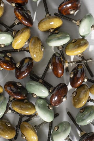 Keramik knopp i rundad modell med stomme i antik guld. Glaserad färgad modell som finns i tre nyanser