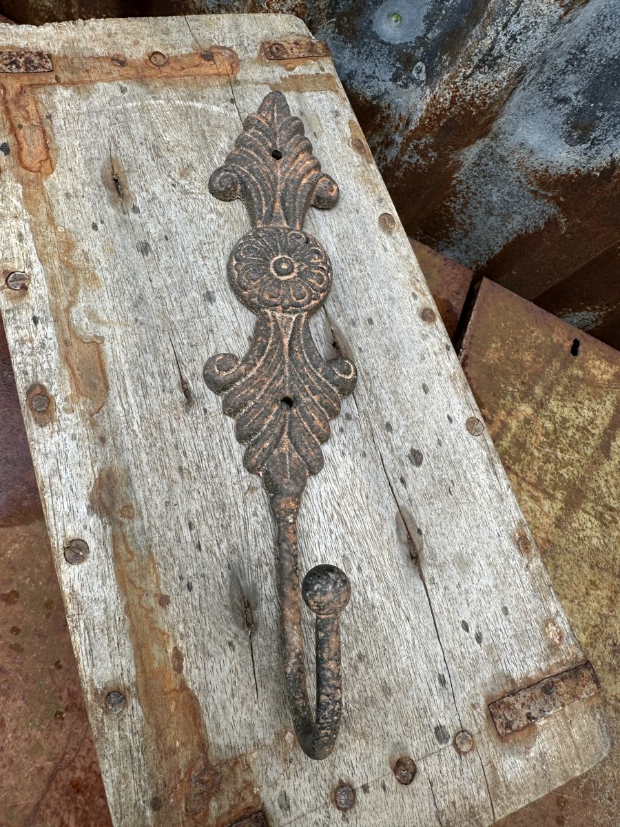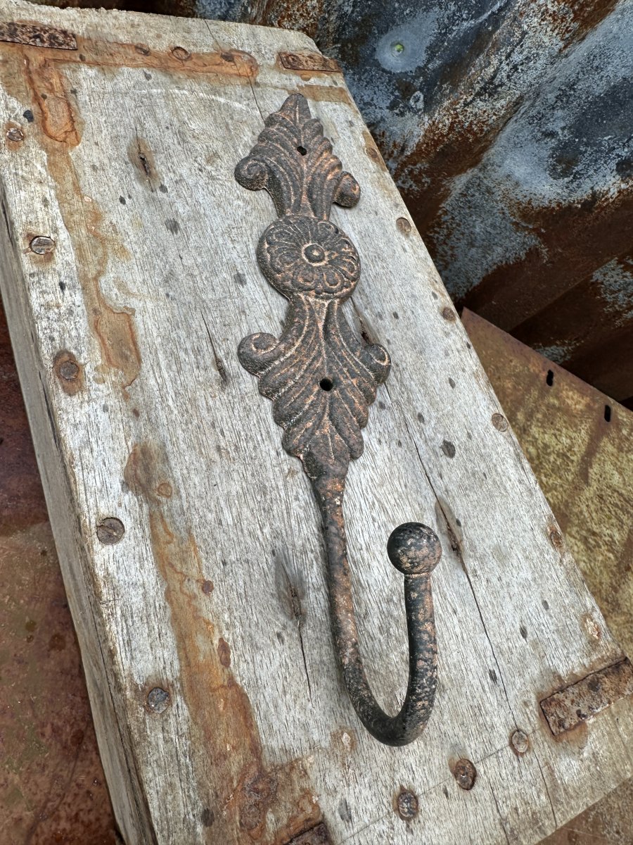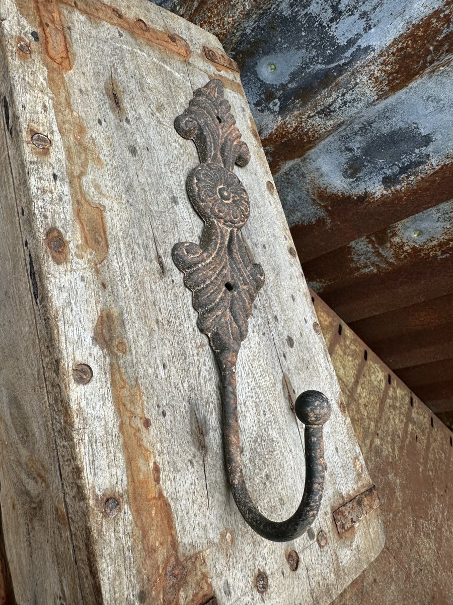 Rostig järn krok med dekorerad rygg