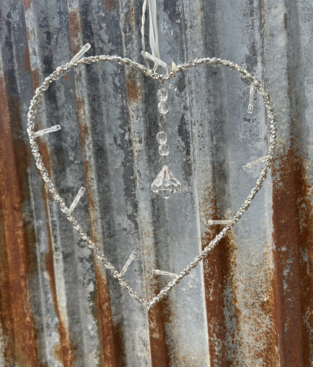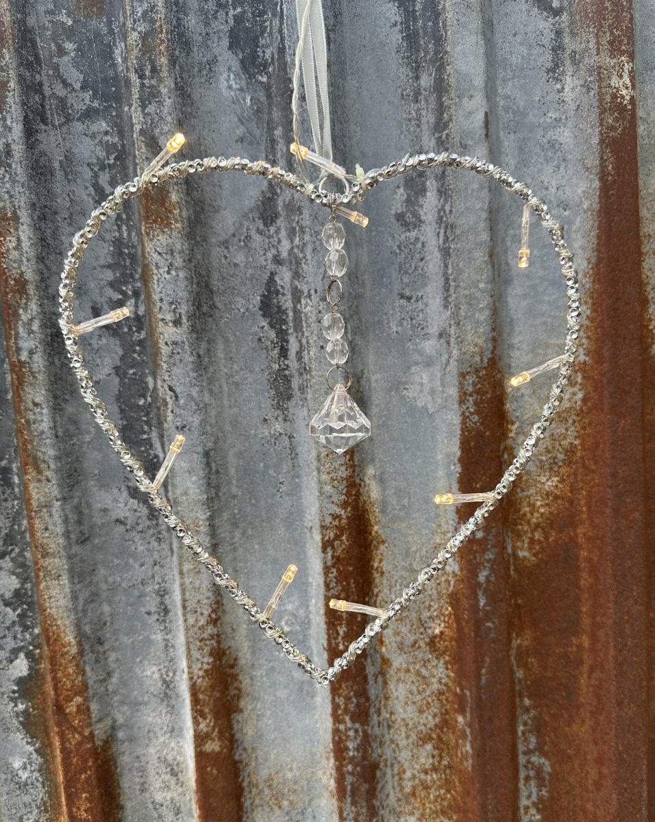 Vacker hjärta med batteridriven ljusslinga. Dekorerad med strass runt stommen och en stor prisma i mitten. Att hänga i fönstret på dörren eller liknande. Batteridriven med tre AA batterier ( ingår ej) av och på knapp på batteridosan. Lika fint tänkt som släckt .