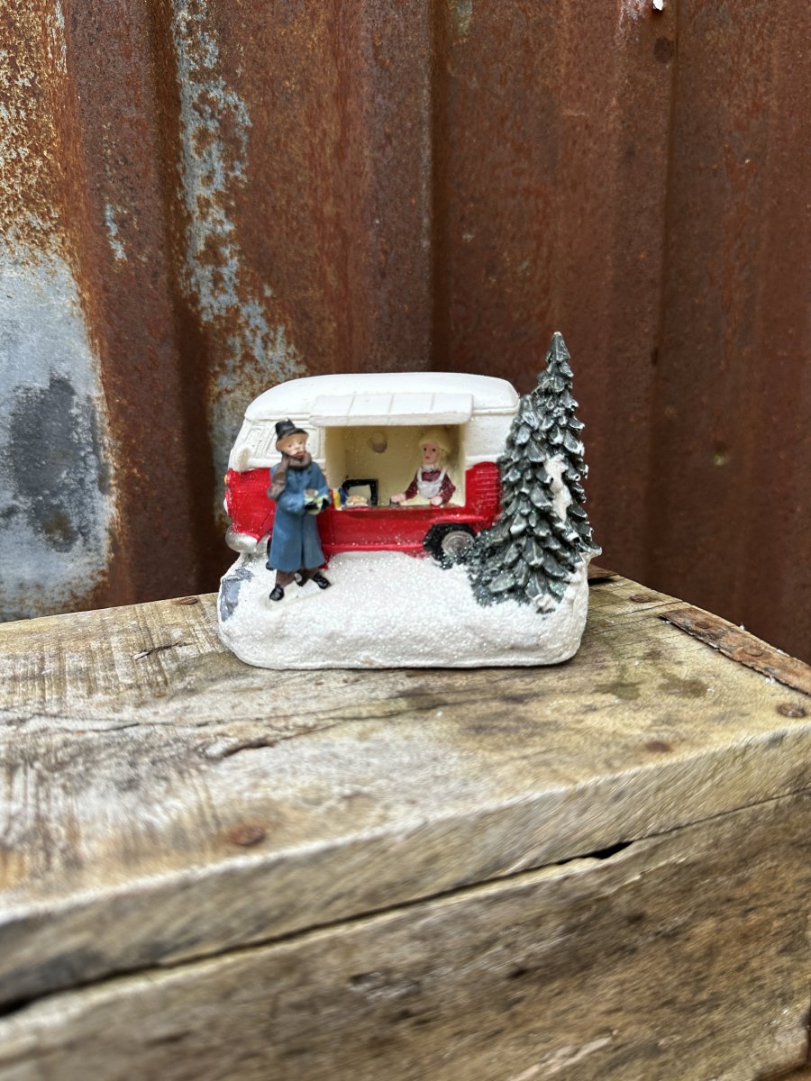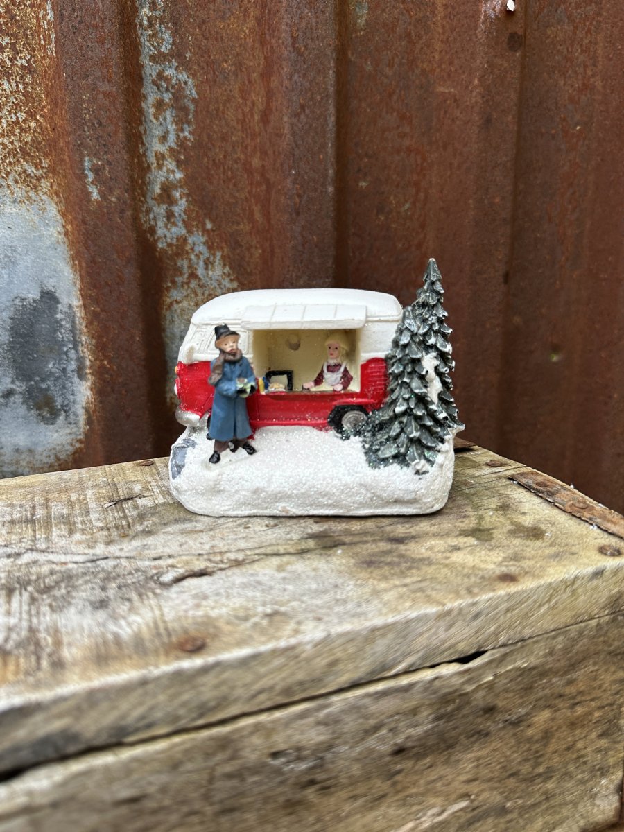 Matvagn i vinterskrud med belysning Dekorerad med glittrade snö och gröna granar. Detaljfull och välarbetad att dekorera med.