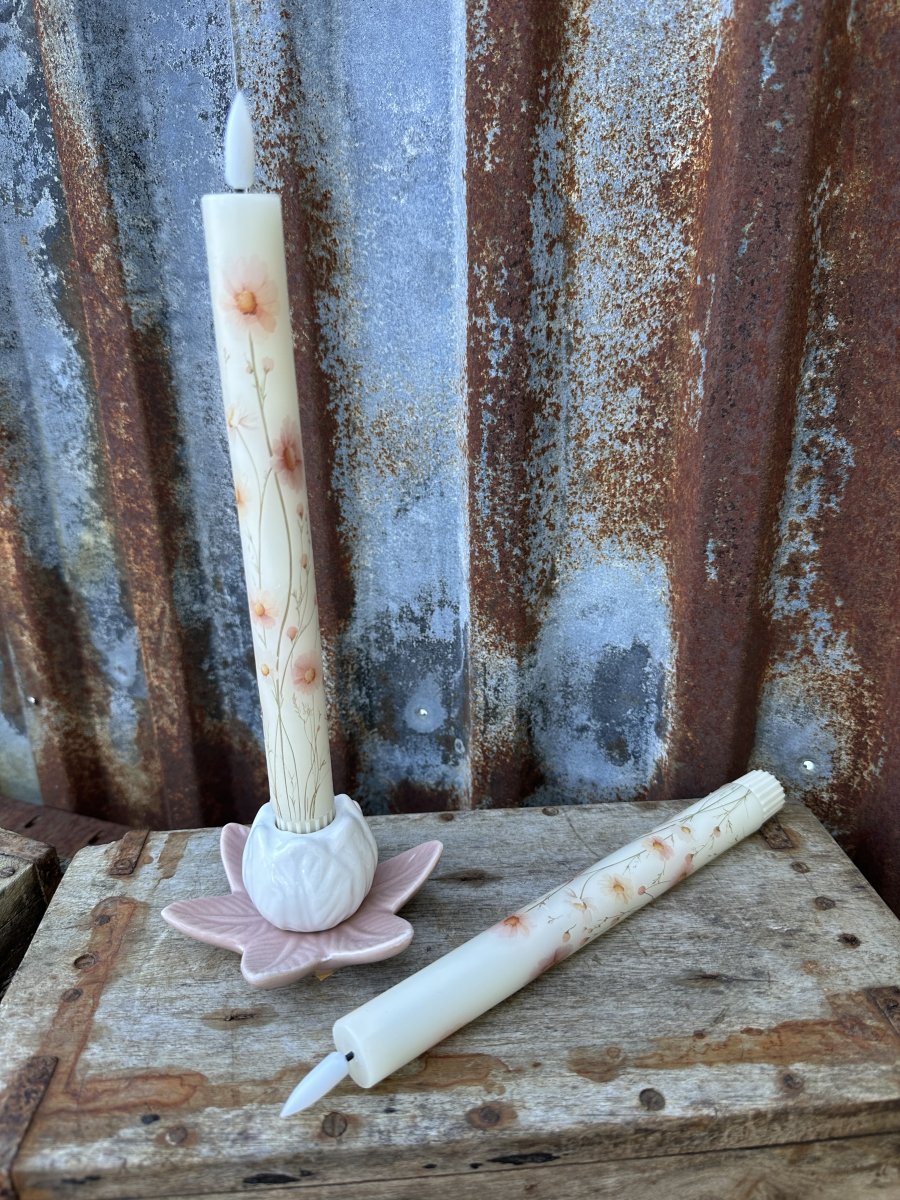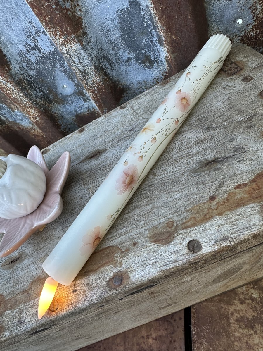 Vackra sommar dekorerade timerljus / antikljus med varmt klart sken vitt ljus. Dekorerade runt om med sommar blommor i mjuka nyanser. Ser ut som vanliga ljus men går på batteri. Säljes i pack om två ljus. Drivs av två AAA batteri (ingå ej). Ger ett stämningsfullt och vackert sken. Har timer om 6 timmar.